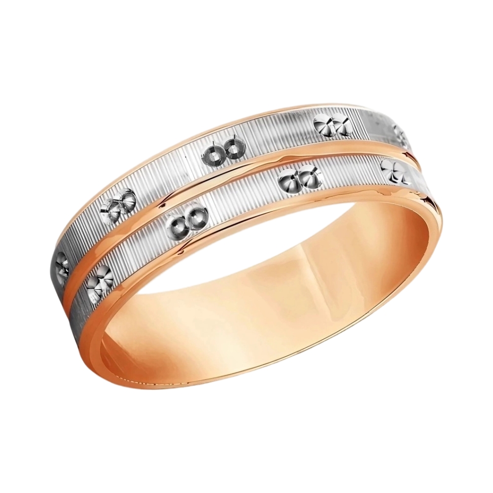 Стильное обручальное кольцо, выполненное в сочетании красного и белого золота 585 пробы.. Середина кольца выполнена в технике алмазная грань, благодаря чему кольцо смотрится очень ярко и эффектно.