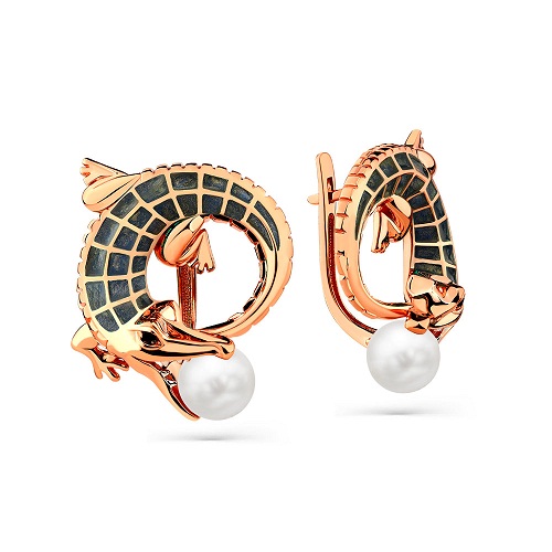 Серьги из красного золота с жемчугом, эмалью и фианитами 033638