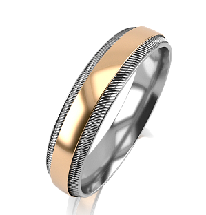 Обручальное кольцо, выполненное в сочетании желтого и белого золота 585 пробы: основание из белого золота, вставка в центре кольца - из желтого.