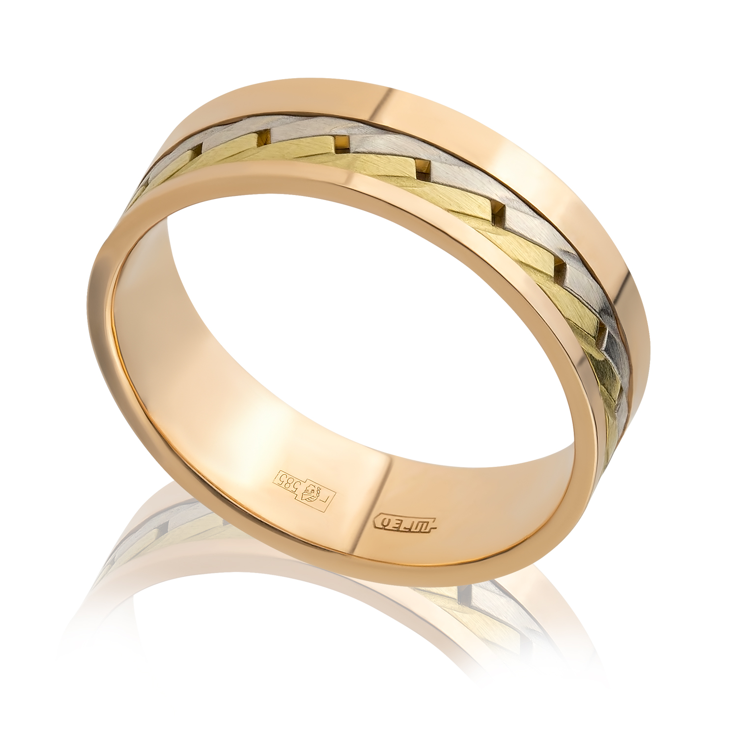 Обручальное кольцо ручной работы, сборное, из красного, белого и лимонного золота 585 пробы. Ширина кольца 6 мм.