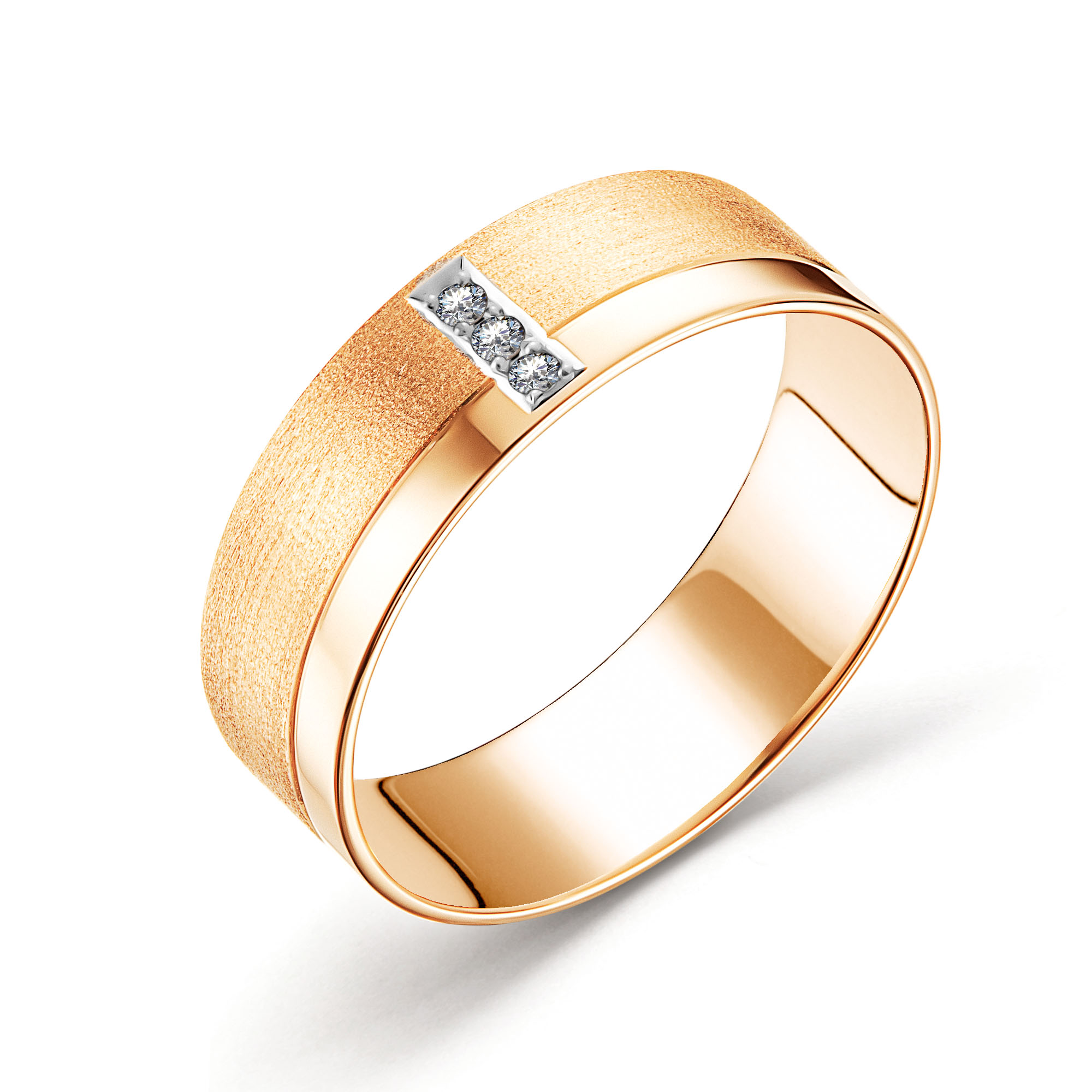 Обручальное кольцо из красного золота 585 пробы в стильном дизайне. Кольцо выполнено в европейском стиле, особенностью данного кольца является матовая поверхность, украшенная тремя бриллиантами.