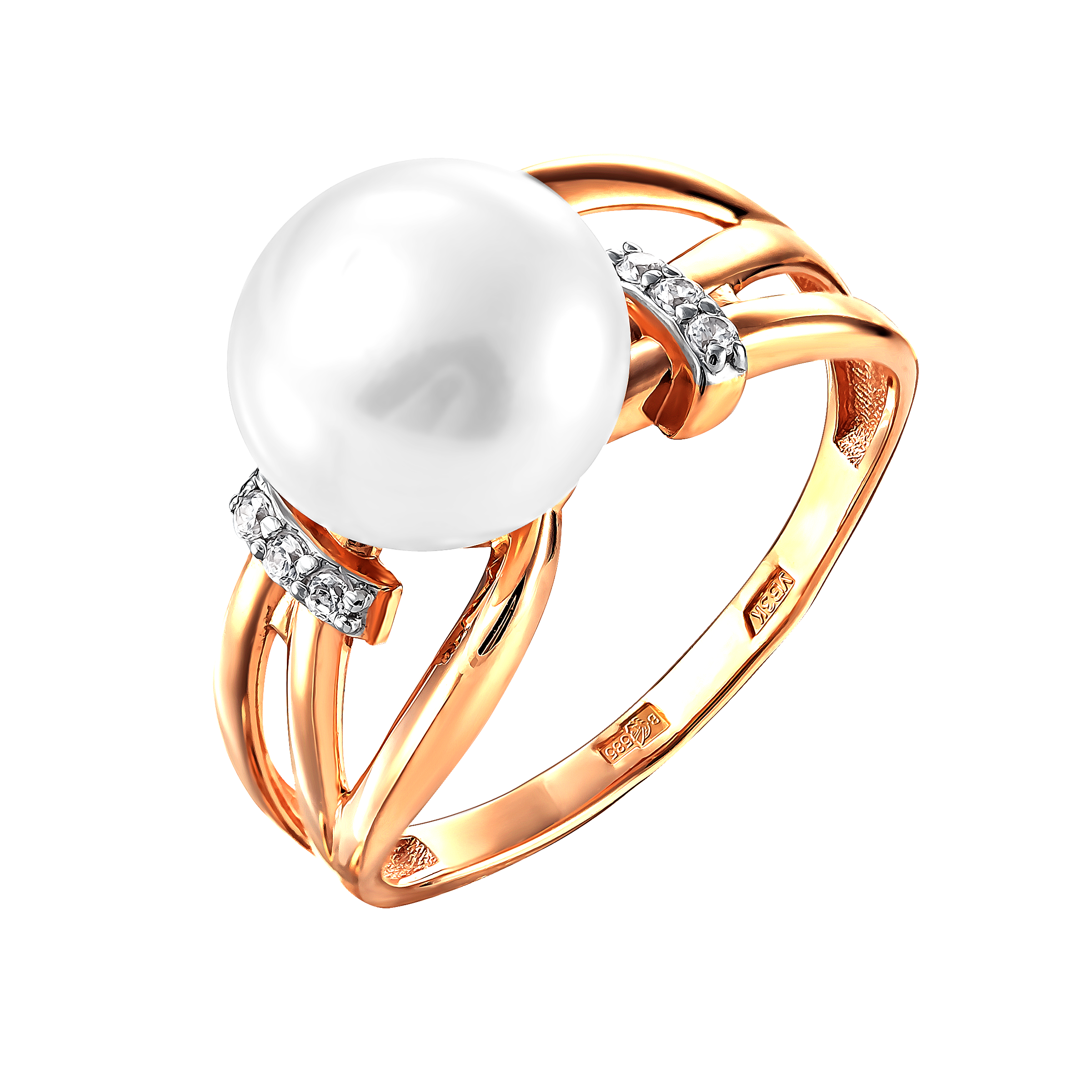 Кольцо из красного золота с жемчугом и фианитами