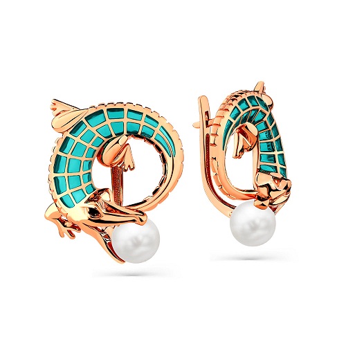 Серьги из красного золота с жемчугом, фианитом и эмалью