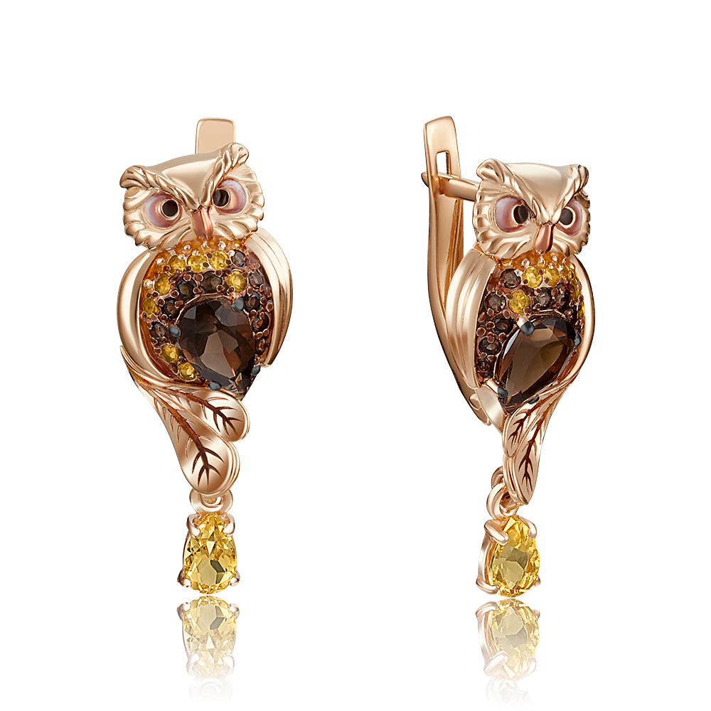 Серьги в красном золоте с кварцем, цитрином и эмалью 086383