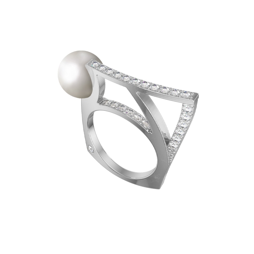 Кольцо из белого золота с жемчугом и фианитами