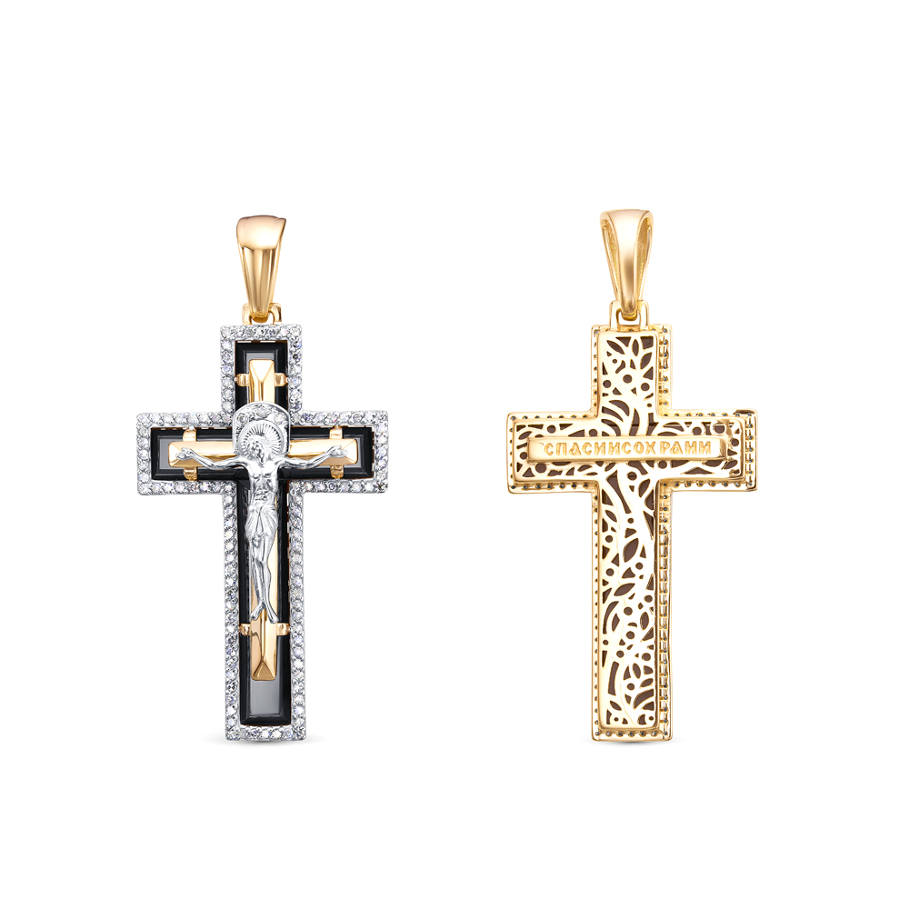 Крест из желтого золота с ониксом и фианитами