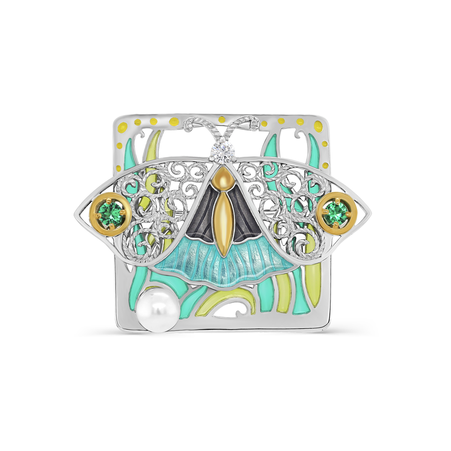 Брошь из серебра с фианитами, жемчугом и эмалью