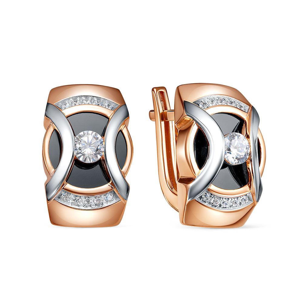 Серьги из красного золота с бриллианитами, ониксом и фианитами